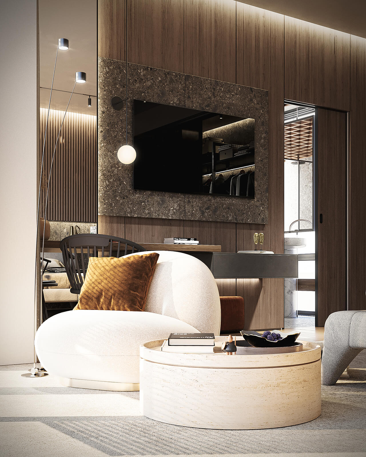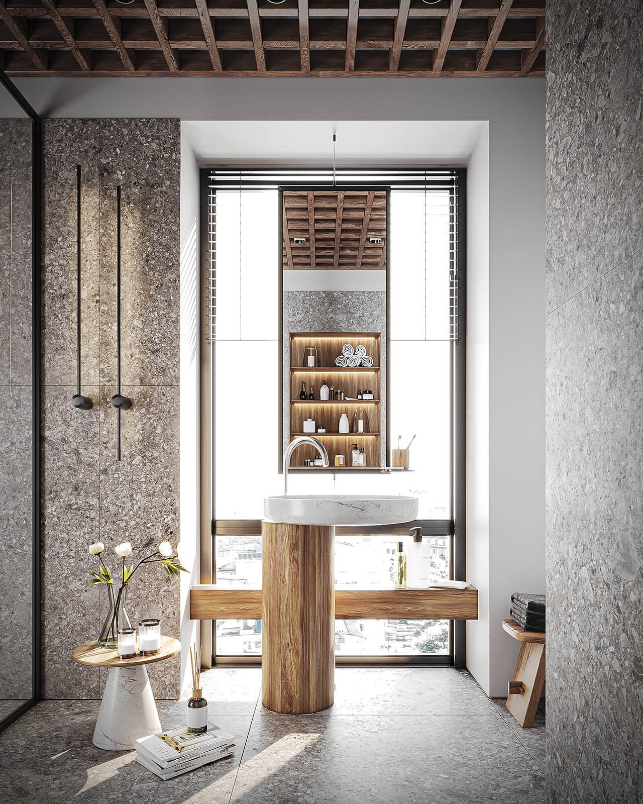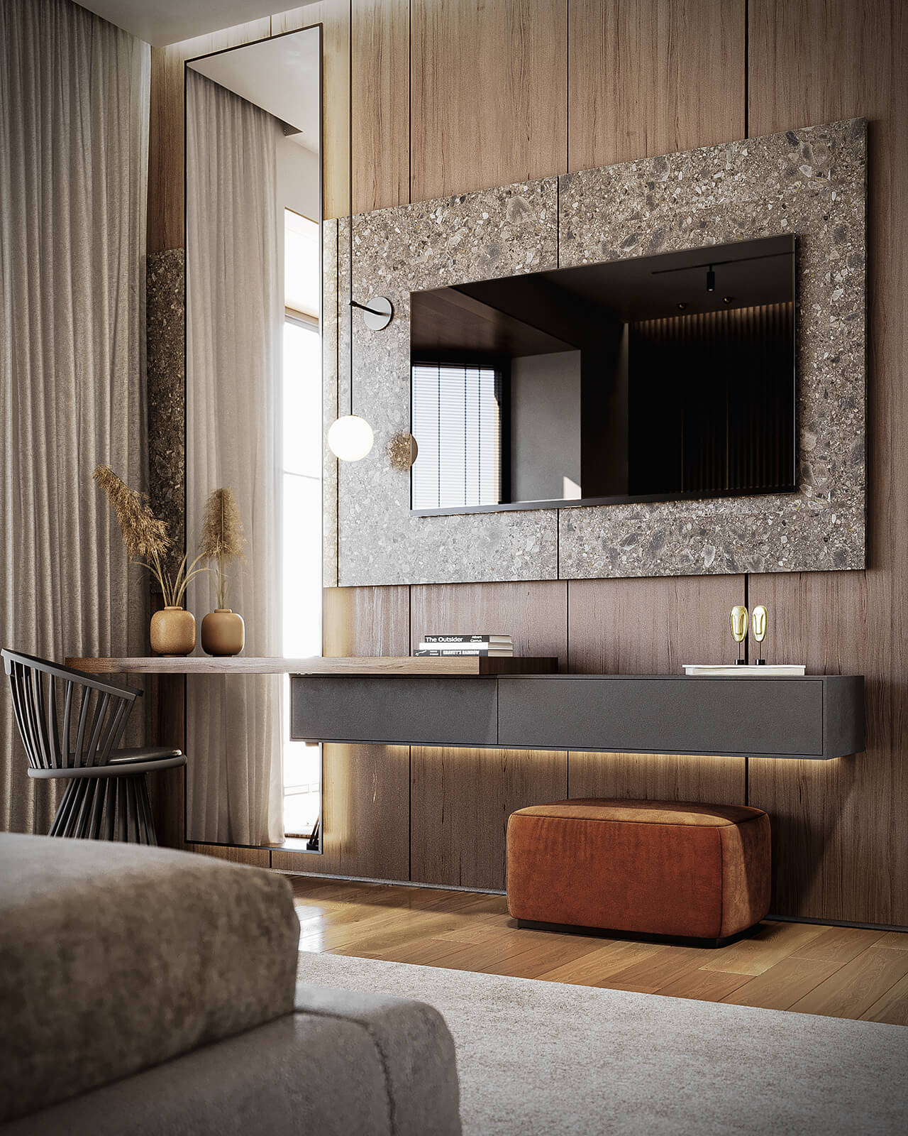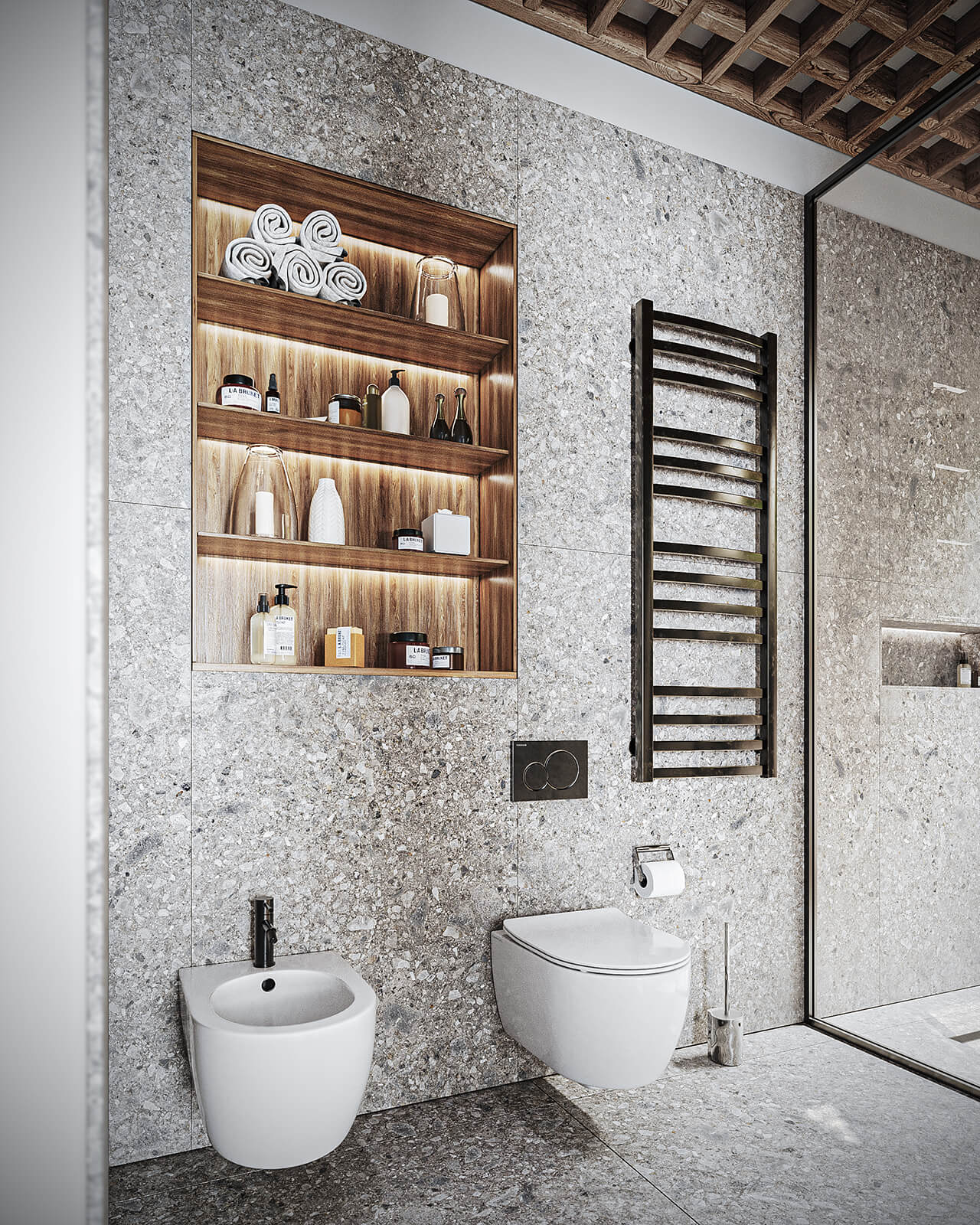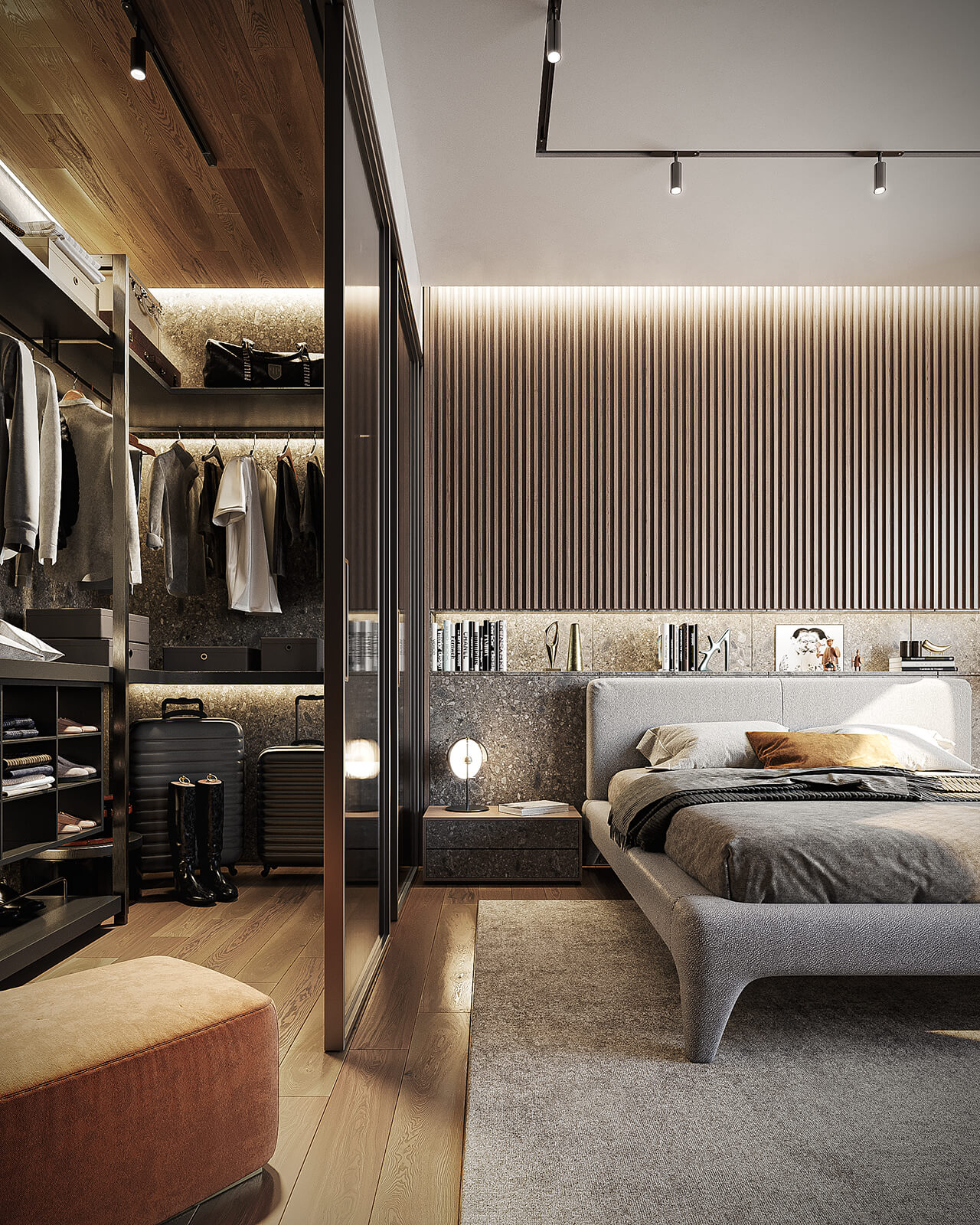 Series of images born from the design of an environment characterized by strong contrasts of wood and stone, but alternated with lighter elements such as the glass walk-in closet in the bedroom and the green area of the bathroom. There are also several accent lights to create points of light that further lighten the scene.
