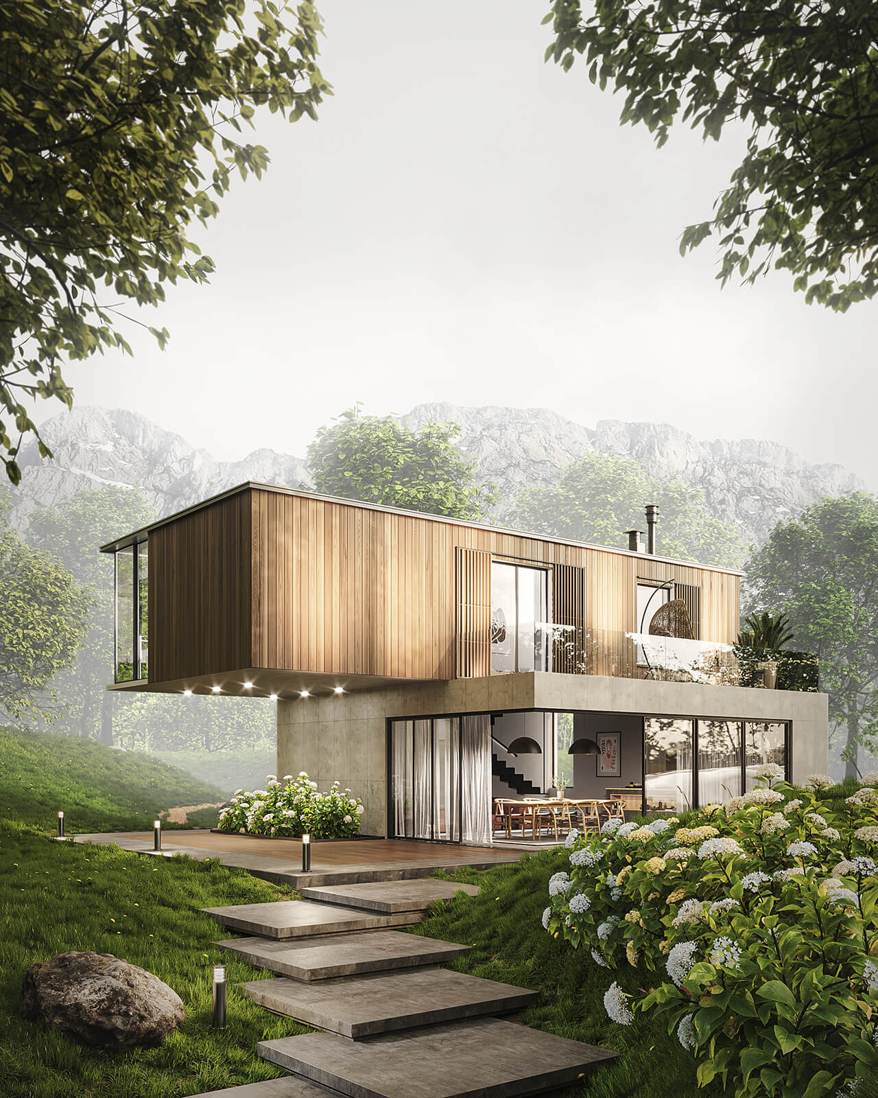 Lighting study of a small building lost in nature, observing how the sensations of the observer vary according to the light conditions. For the lighting of the scene, different HDRIs were used on which the interior or fill lights of the scene were adjusted. For the structure I used strong materials such as exposed concrete for the structure and wood to recall the surrounding environment.