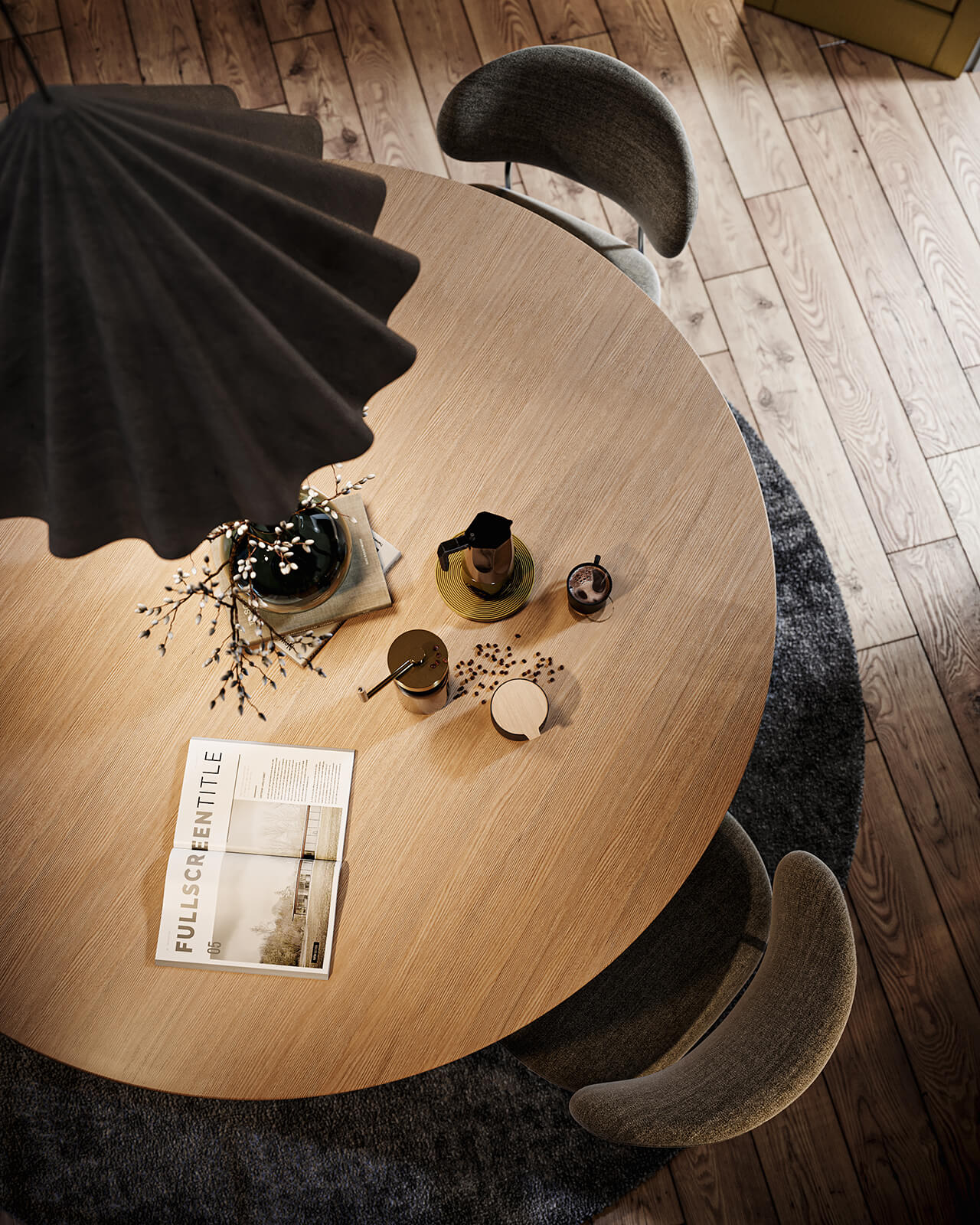 Project created starting from the combination of yellow and blue colors that gave life to a project of a dynamic and modern living area. I wanted to represent the coffee break on a winter evening by moving from the table to the comfort of the armchair near the fireplace. For the moka protagonist of some shots, complex materials were created using different textures of scratches and dirt.