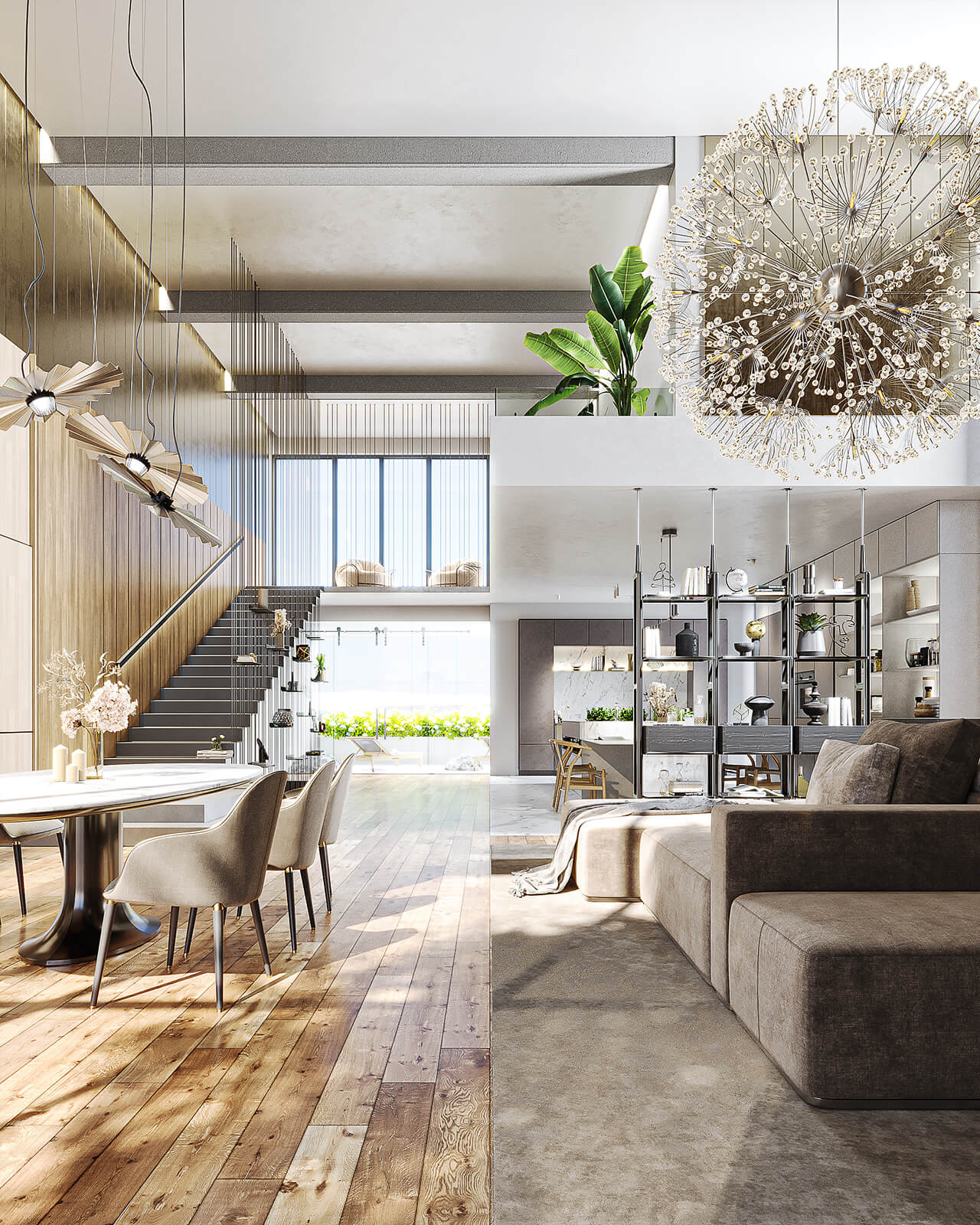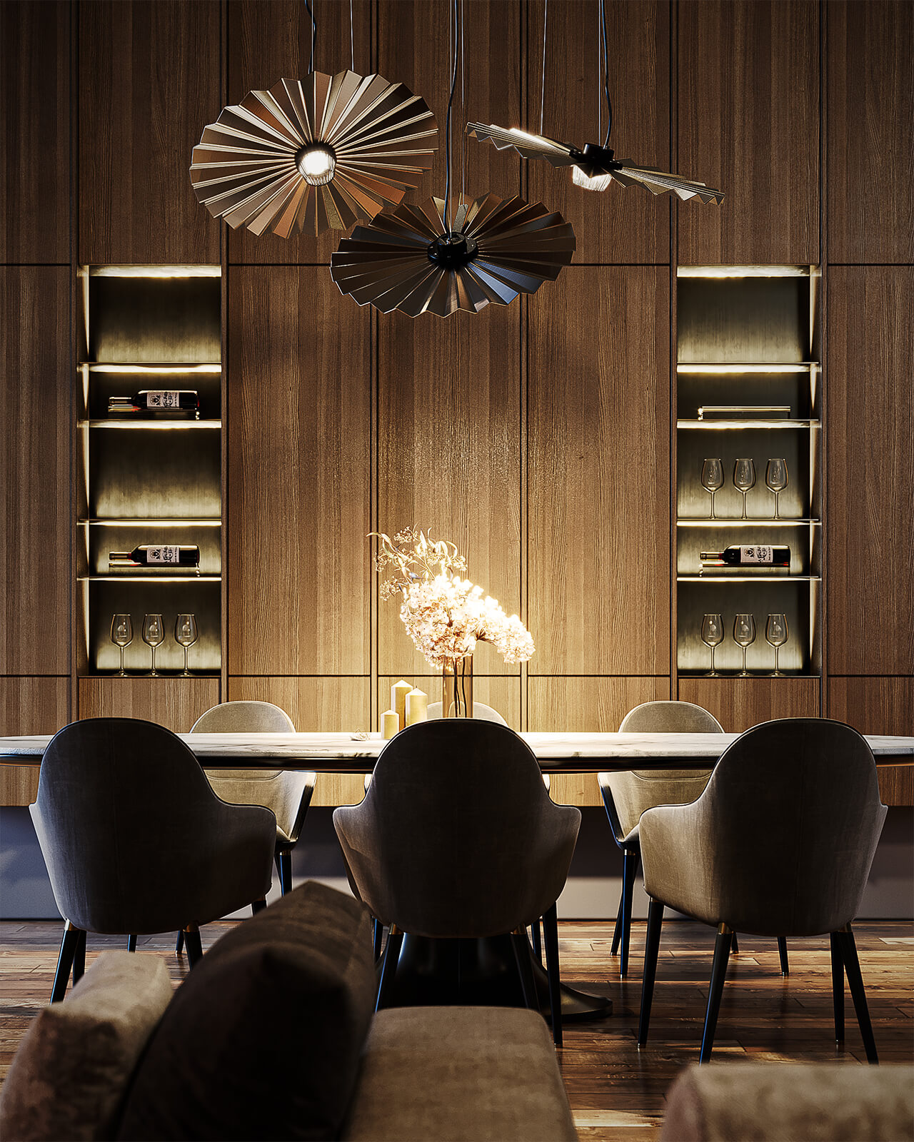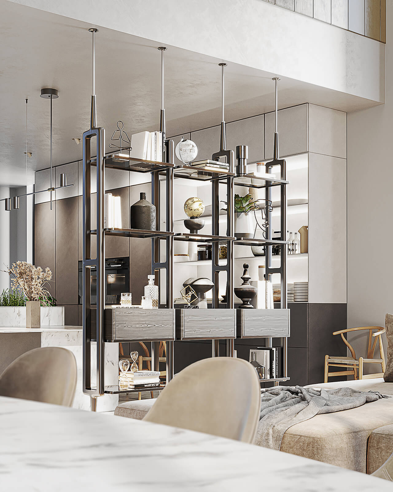 Project of an airy and elegant environment characterized by boiserie on the walls and cleanliness of the finishes. The large windows in the living area make the environment very bright while the fireplace and the boiserie make it warmer and more cozy. This project includes various detailed views on different environments or furnishing elements, in which I have deepened the study of materials as well as more detailed lighting.