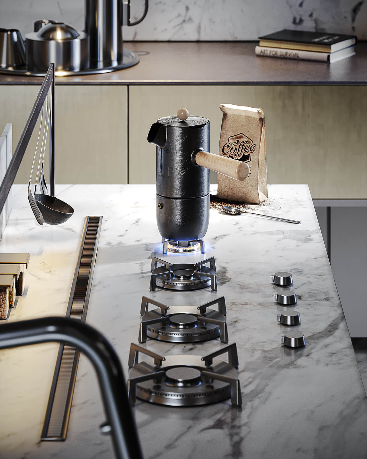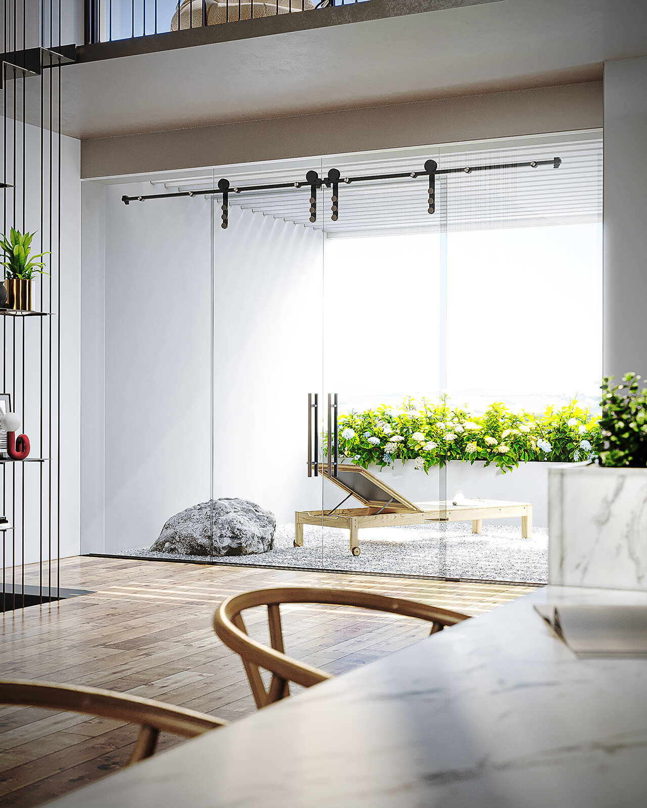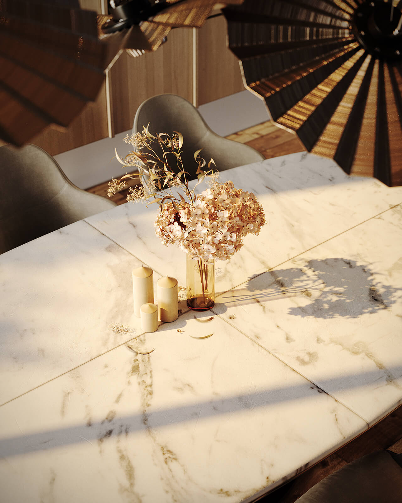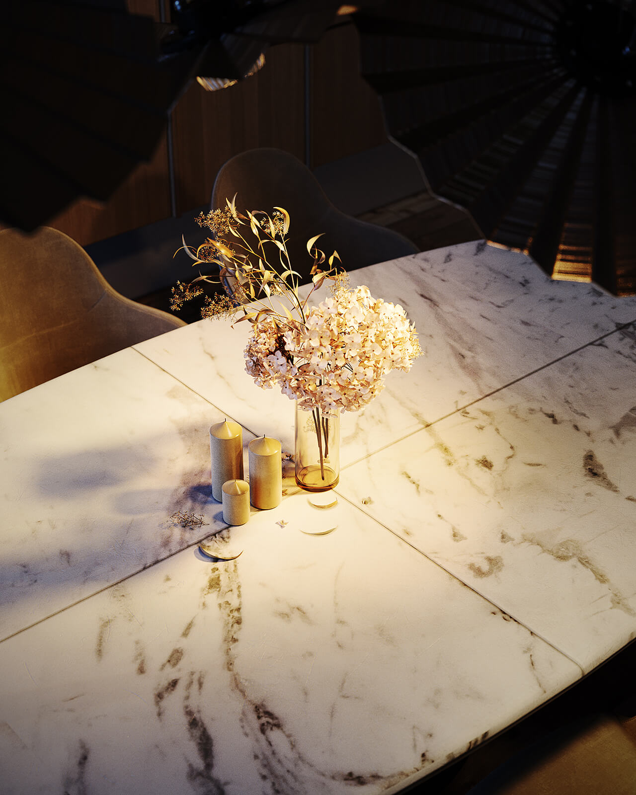 Project of an airy and elegant environment characterized by boiserie on the walls and cleanliness of the finishes. The large windows in the living area make the environment very bright while the fireplace and the boiserie make it warmer and more cozy. This project includes various detailed views on different environments or furnishing elements, in which I have deepened the study of materials as well as more detailed lighting.